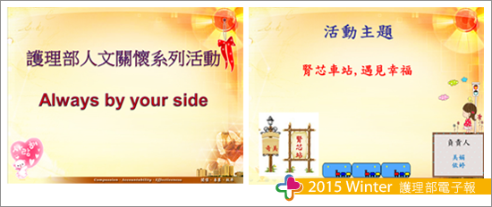 血液透析室是由護理人員、技術員、護佐及醫師共同組成的一個大家庭,由於工作上的需求大家彼此間經過無數個數不清的日子裡,藉由合作互動牽引下,已經在不知不覺中維持一種無聲勝有聲的默契關係。希望藉由「腎芯車站,遇見幸福」的活動牽盼下,大家彼此間可以感受到血液透析室的人情味、真心的被關懷有如一家人的感受,用「心」關懷更希望藉由這股正向的力量可以渲染更多的人,不只是單位的工作人員能接收到,也希望本單位以外的人,甚至病人、家屬也都能感受到我們真心的關懷,一起來體驗到這份出自於內心所得到的關懷。