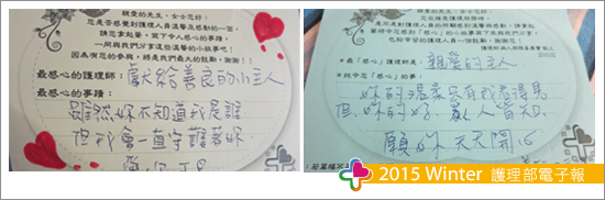 「飛鴿傳情」-利用單位的廢紙卡,分發給每一位同仁,採不具名方式,將卡片傳遞給每位小主人,在緊湊的護理工作中,當主人收到卡片時,雀躍心情的心情足以抵擋一天的疲累。