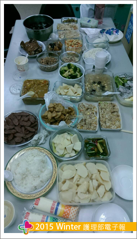 在6A的大家庭裡,工作忙碌讓每個人的喜怒哀樂都隱藏起來,某日的午餐飯桌間,聽到學妹說:「許久沒有回家吃媽媽的家常菜了。」,這突如其來的感慨引發我們的共鳴,有人立馬提議:「不如我們來辦一人一菜?」,接下來是一陣贊同聲,讓離家在外的我們吃到熟悉的家常菜,而不是便當,就這樣「一人一菜」的活動開始囉!活動當天,每個人帶著自己精心準備的料理,或是請長輩(媽媽或婆婆)準備美味佳餚,最平凡的山珍海味擺滿整桌,我們吃得開心又滿足,心裡默默感動與溫暖著,深刻感受及珍惜同事之間的情誼,讓當天下午精力滿滿,有充足的體力照顧更需要被關懷的病人。