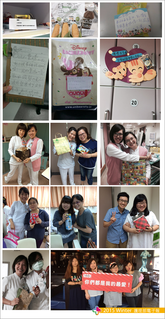 今年「護師節」也有別以往聚餐方式,行政活動組提議「小天使小主人的關懷活動」,這個活動大家都可以參加,不會有時間、地點的問題,所以一致通過。此活動就在三月的病房會議裡,諜對諜的氣氛中展開,剛開始大家都在摸索自己小主人的個性,努力想著用什麼驚奇的方式關懷他,然而一個小餅乾、小西點,或是一張手寫的小卡片都讓同事感受上班忙碌中,有個人默默地關懷著,心情真是難以言喻的窩心。