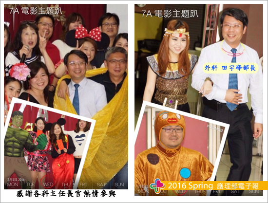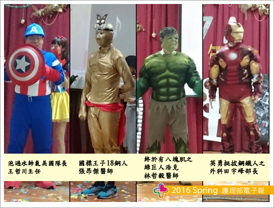 外科田部長 以帥氣的英姿帶著埃及豔后出場、吳南鈞醫師的具大可愛薑餅人牽著美少女戰士走秀大中小size 的白雪公主,真的是好不熱鬧啊!王格之爸爸用攝影快門咔喳,也將我們精彩的花絮一一記憶下來!走秀之餘當然勉不了懲罰未切合主題的人啦! 登、登登~登 《外科田宇峰部長、鋼鐵人、外科醫學部王哲川主任美國隊長、口外林哲毅醫師 、綠巨人浩克、 張昂傑醫師的18銅人 、超人詹浩呈醫師、口外顏欽堉主任真的是高潮不斷啦!