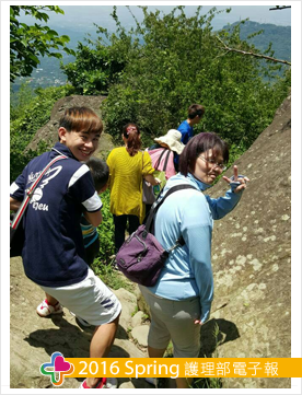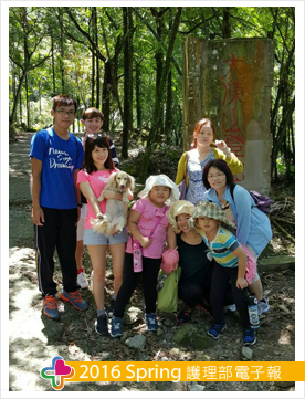 天氣極好、艷陽高照,我們這些平時窩在醫院裡的溫室花朵難得一起出來擁抱太陽、親近大自然、挑戰登頂這種不可能的任務;在籌畫活動時大家可是自信心滿滿的,開車前往爬山起點的路途中大家也是士氣高漲呢!這次同行的總共有9名成員,6位平時在醫院推工作車狂奔腿力訓練有素的護理人員、2位活潑健壯的小朋友、1位肥短可愛的臘腸狗,我們相信這次的登頂行動不成難題。