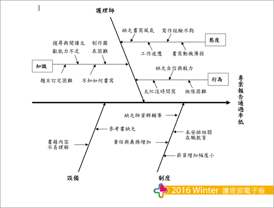 本單位近4年來專案報告完成率與通過率皆為0%, N3層級護理師們的學術能力有待改善之必要性,故依護理師的知識、態度、行為與制度設備層面予探討其原因,並歸納出特性要因圖(見圖二)。筆者將專案書寫通過率低之原因彙總整理如下: