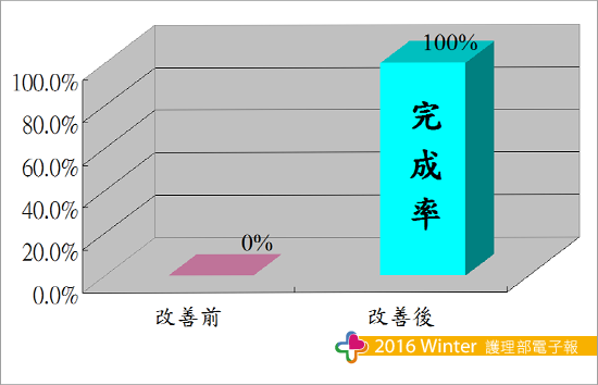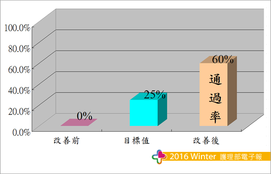 專案實施期間共完成5篇專案報告,書寫率由0%提升至100%,於2015年5月完成送審作業,評值結果於2015年10月底台灣護理學會審核通過共有3篇,通過率由0%提升至60%。