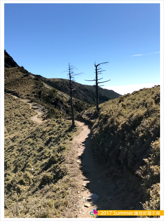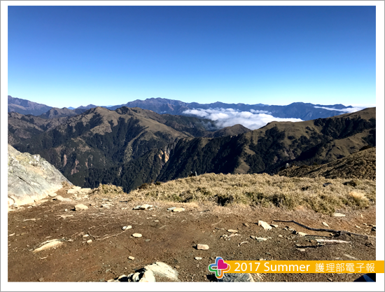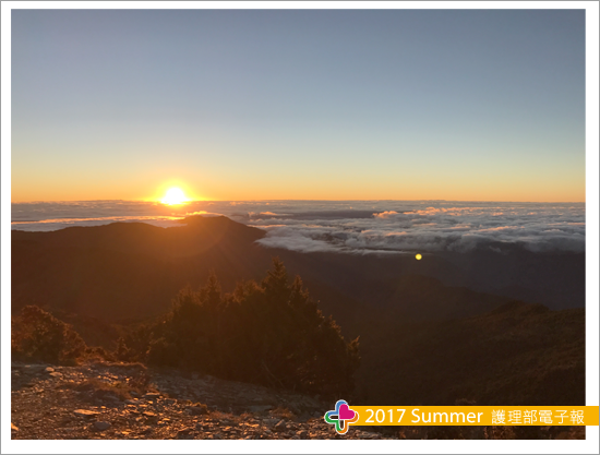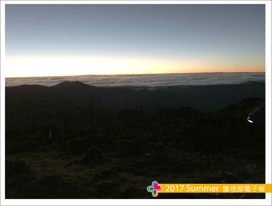 隔天凌晨三點,在山友的呼喚下,睡眼惺忪又冷到顫抖的我,在簡單暖身後,便背起行囊,往向陽山前進,預計迎接今年的第一道曙光。沿途幾乎都是Z型陡坡,十足考驗人性的毅力,又黑又冷、又濕又累,只能用口鼻大口喘息,每一步都舉步維艱,一路上不斷質疑自己的體力,也想念家中暖呼呼的床,放棄的念頭不斷在腦中湧現,卻也害怕腳步太慢而脫隊,根本無暇說要放棄。抵達稜線時,曙光尚未升起,但雲海上已蘊染了淡淡的金黃色,像是一蓆特製的棉花被,輕柔的蓋在中央山脈群,沉睡的大地即將甦醒了!終於,太陽緩緩的由雲層中露臉,我們忍不住心中的雀躍,一起吶喊,互道:哈囉~2017年第一道曙光來了~新年快樂!