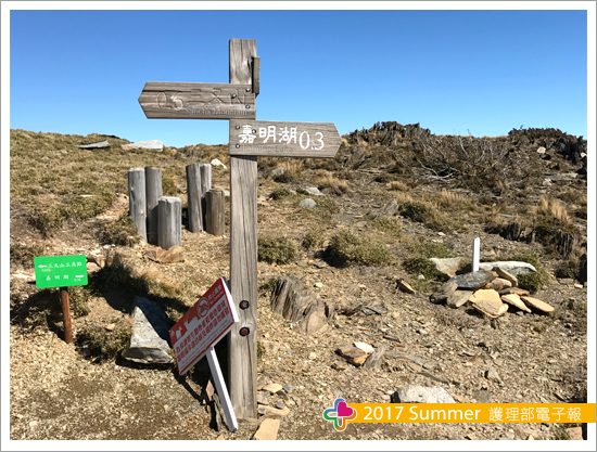 人生總是充滿無數的選擇,為了能一窺嘉明湖的美景,我選擇放棄登上百岳–向陽山,前往「嘉明湖避難小屋」稍作歇息後,便再出發,沿途有三個陡下坡,還需翻山越嶺(向陽北峰)才能到達三叉山登山口,還好沿路風景壯闊–北眺玉山群,南望北大武,雖無高大樹木聳立,但奇石峋嶙與幾顆玉山圓柏點綴在箭竹草原坡道,腳下還有尚未融化的冰霰。走下向陽北峰,迎面兩株迎賓樹在遠方招手,鼓舞著我們,再堅持一下吧!當在三叉山登山口見到嘉明湖指標時,我知道離自己的目標不遠了,我再度選擇捨棄三叉山,邁向我心之所嚮,終於皇天不負苦心人,在11點半抵達那傳說中~天使的眼淚~嘉明湖。