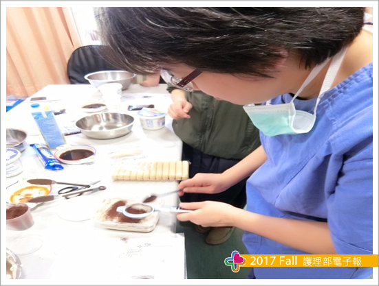 今年正好有個契機,單位主管提到有好幾位人員對烘焙也有興趣,或許可以邀請他們來授課,所以與品管圈圈員討論後,今年單位關懷活動,就不辦制式的座談會,改辦紓壓的烘焙課程,於是我毛遂自薦,也找了【免用烤箱的甜點:提拉米蘇】食譜,邀請了單位新進人員、在職人員、單位主任一起同樂,過程中我向大夥講解:講義內容(很專業)、備料、機器使用、實際示範、食物特性、裝飾等,感覺自己就像講師(哈哈),同事們就像學員,聽得很認真、筆記滿滿,實際操作到成品完成時更是興奮,畢竟外面一堂課都要2000-3000元不等呢!(上到等於賺到)。課後單位人員給的回饋也很正面,大家也對自己的作品都非常滿意,也希望還有下一次的烘焙課,這些鼓勵給講師又打了一針強心劑(課前超緊張)。所以,這門課我會繼續修下去的,希望有機會再替單位辦烘焙或烹飪療癒課程。