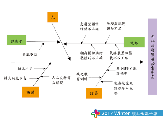 壓瘡易出現於臥床、醫療輔具壓迫、免疫力不足、老年、營養不良及大小便失禁病人。壓瘡發生不但增加治療痛苦,若未妥善照護導致傷口感染,引發敗血症而威脅生命,使得醫療成本及臨床護理時數增加,延長住院天數,產生醫療品質負面影響(李、胡,2012;吳、侯、黃,2015)。本病房為胸腔內科病房,2014年1月至6月平均壓瘡發生率攀升至1.69%,遠超過護理部的閾值<0.09%。臨床常接獲病家抱怨護師衛教翻身擺位方式不一致,或直到皮膚已明顯受損,才向醫護人員反應,故引發改善動機,藉此了解壓瘡高發生率的原因並進行改善。