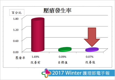 專案小組多次於交接班與人員討論執行的困難與分享經驗,並強化皮膚照護的重要與預防重於治療的概念,最終內化至皮膚照護過程,壓瘡發生率由1.69%降至0.07%,遠超過本專案目的。對病人而言,可維護就醫安全;對護理師而言,是照護能力的肯定,且小組以「安全髮箍」參與護理部創新競賽,間接提升成就感與工作價值;對醫院而言,可避免因壓瘡導致延長住院天數而增加醫療成本,實為三贏。