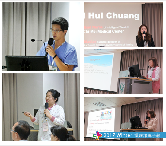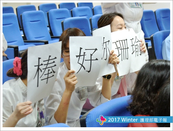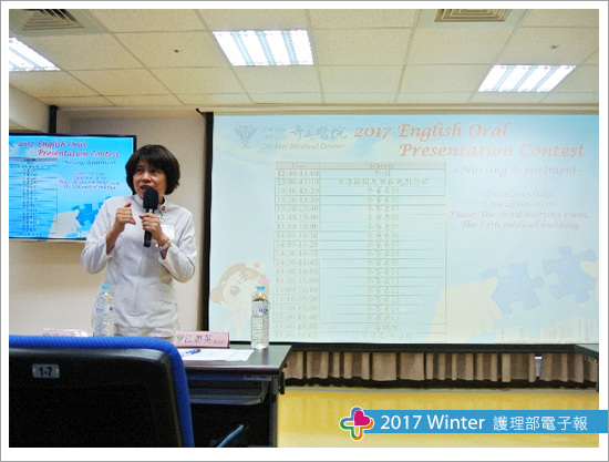 雖然護理部第一次舉辦兼具學術與展現外語能力的活動,出乎預料的不但報名踴躍額滿,參賽者們均展現超水準的表現!此次活動比較刺激部分為參賽者報告順序是採當天現場抽籤方式,故大家均繃緊神經且躍躍欲試的複雜緊張心情提前到場準時抽籤,抽籤當下參賽者的神情可想而知,但隨著自己報告順序確定,凝重神情稍稍緩和下接續活動的開展,主持人王維那護理長首先邀請護理研發委員會超主席江惠英副部長幫競賽活動暖身致詞,緩和現場緊張的氣氛,接著則是請我們重量級的評審委員王志中副院長、兒科部周琪部長(外籍評審)、護理部江惠英副部長、醫研部許少冠專員,分別以英文跟現場人員問候,讓大家能順勢融入這即將到來的英文學術盛宴。