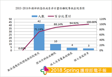 將急性病房非計畫性離院原因,繪製成精神科急性病房非計畫性離院導致出院原因之柏拉圖(圖一)。