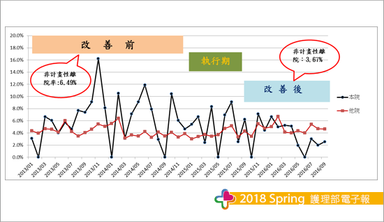 本專案小組成員透過病歷回溯、問卷調查進行現況分析,了解因非計畫性的離院導致出院相關原因,藉由改善措施介入後成效明顯改善。