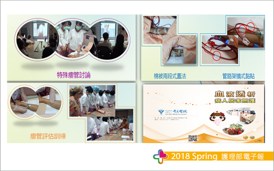 瘻管是透析病人的第二生命,透析後瘻管自我照護對於透析病人而言是相當重要的課題,因此透析病人瘻管自我照護能力就顯得格外重要,我們除了給予病人瘻管照護衛教外,更將其納入常規每月衛教的重點,衛教對象更延伸至主要照護者(如家屬、外籍看護),並應用多元化的衛教資訊(例如衛教手冊、圖像教學、瘻管訓練輔具)來提升病人及照顧者對瘻管照護的能力。病人在家也能隨時以電話諮詢,有關瘻管照護的相關問題,使其不僅能在院安心透析更能享受正常的居家生活。