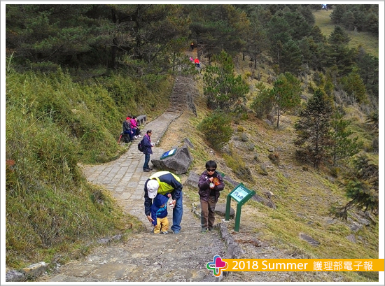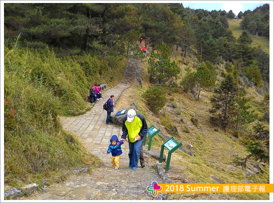 二個孩子原本還開開心心邊走嘻鬧著,不料在上坡路段走沒幾步小兒子喊著腳痠走不動,吵著要抱抱,先生就一把抱起兒子坐在肩膀上,我們也沿途吸著森林芬多精ヽ欣賞湛藍天空ヽ層層疊疊的山巒以及神木群非常壯觀,中途遇到一顆高聳的大鐵杉,來到這邊的遊客不是坐在大鐵杉旁休息,就是停留下來拍照。前往麟趾山的步道上,有陡坡、有平順的路也有小碎石路,當走累時只需稍稍停留下來休息,貪婪著欣賞這萬巒群山風起雲湧,高山壯觀美景,心情頓時豁然開朗。