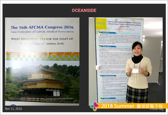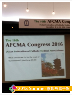 【16th AFCMA Congress 2016】係亞洲天主教健康照護聯盟為凝聚天主教醫護從業人員,每四年會舉辦國際大會,據我所知,2012年(15th)在巴里島、2008年(14th)是在香港舉辦,今年的主題:What Should We Do for the Least of Our Brethen?研討會主要議題:(1)年長神職人員之健康照護制度(2)愛滋病照護於亞洲國家之現況及困境(3)年長病人之末期照護(4)兒童保護及人權維護。