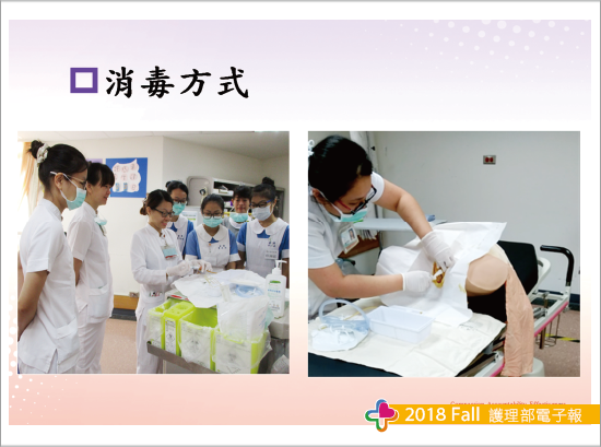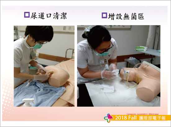 二、 舉辦教育課程,強化導尿管置放過程中,以無菌治療巾擴大無菌區範圍、落實尿道口周圍消毒(圖四、圖五)。