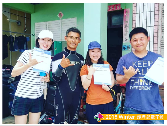 第三天 :終於到了海洋實習,建議大家想去潛水前,要先看一下農民曆是大潮或小潮,這次浪大到差點連最後的海洋實習都無法完成。由於初階潛水都是岸潛。就是說是你要穿很重的裝備,從岸上先游到比較深的開放水域,在開始潛水,因為浪很大,讓游泳變得很費力,游快到了,下一秒又被浪給打回原點真的讓人崩潰到不行,大自然的力量讓你對海洋又是敬畏又是恐懼,外加一個七月份沒事幹嘛去潛水的心理壓力。小心翼翼的跟在教練的左右,遇到湧、面鏡進水等,海中的每一件事都讓我神經緊繃,還好最後比較習慣才能放鬆的游。因為緊張呼吸就會快,中性浮力就會控制不好,也就是說你要靠你的呼吸控制你的上升和下降。