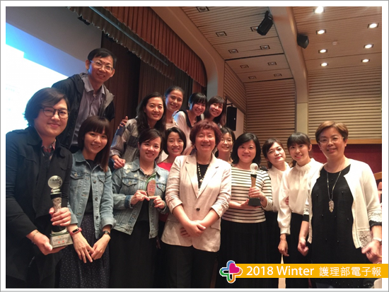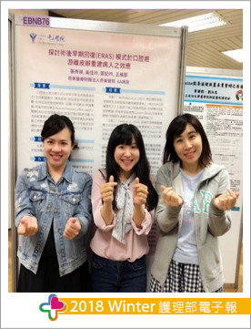 此次我們單位以口腔癌游離皮瓣術後病人照護品質為主軸,探討術後早期回復(Enhanced Recovery After Surgery, ERAS)運用於該族群之照護成效,運用實證精神進行大量文獻檢索與評讀後完成實證讀書報告「探討術後早期回復(ERAS) 模式於口腔癌游離皮瓣重建病人之效應」。另維那護理長與學姐等人,則是先進行文獻評讀了解口腔癌病人之疼痛因素,再以單位顯微病房之口腔癌顯微皮瓣術後病人為母群體,共收案139人,以SPSS 20.0 Windows進行統計分析,探討該群體之疼痛因素、時機與藥物使用,結果與文獻相符合,並實際推廣至單位臨床運用,「口腔癌顯微皮瓣重建術後病人疼痛因素之系列病例報告與文獻回顧」榮獲實證應用與研究類組銀獎。