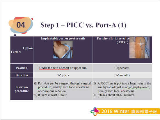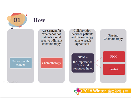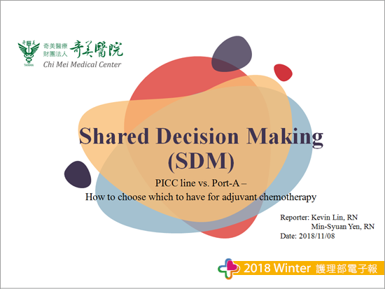這次主題是 【接受輔助性化學治療時,我應該選擇何種植入式化療藥物注射管路?】,報告全程使用英文,並透過影片及情境模擬的方式來讓聽眾知道我們如何運用SDM模式及輔具工具幫助癌症病人選擇注射管路,以維護化療用藥安全。準備過程中因為情境模擬,所以我們借用比賽預定場地排演多次,從主講者到路人甲乙及道具的擺放,加上一次次的修正報告內容,就是希望能在有限的時間內完整呈現我們在癌症照護之專業。