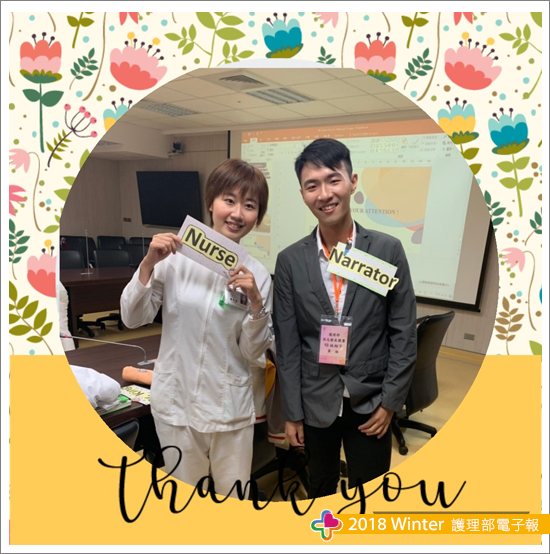 很喜歡英文的我,看到護理部研發委員會辦理英文競賽,原本想約單位同仁一起參加,卻因為一時忙碌而忘記這件事情。偶然聽到單位主管鼓勵兩位學弟妹參加,加上看到學妹的報告內容覺得真是太有才了!學妹製作的PPT開頭是運用Videoscribe軟體製作的白板動畫,用一個故事影片的方式引導觀眾進入演講主題,雖然先前就知道有白板動畫這個東西,只是沒想到身邊同事居然會做,真的覺得很神奇!學妹與護理長討論投影片內容時,護理長認為如果中間可以加入臨床情境,應該可以讓整個報告更鮮活,因此便毛遂自薦希望能參加演出,我就這樣參與了此次的活動。