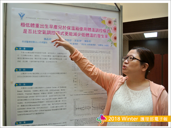 護理部自台灣實證護理學會開辦實證護理競賽以來,多次組隊參賽屢獲佳績,此無不建立了護理人員在學習實證護理的信心,也為了讓奇美護理的實證能力能持續推展出去,規劃參賽的事前準備計畫便格外重要,因此護理研發委員會從去年底便著手規畫進行,從今年3、4月舉辦初階實證護理工作坊,培訓新生代實證護理種子,發展新的實證護理問題,這些護理問題的便可形成投稿台灣實證醫學會、實證護理學會海報的素材,讓同仁有機會可以參加研討會,學習他院實證發展近況,增廣見聞。