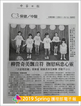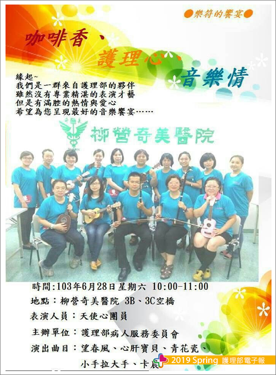 103年在院方大力推展CICARE時,柳奇的病人服務委員會,也進行討論什麼是可以順應院方政策,同時又可以兼顧品質的活動,在委員的腦力激盪下,我們設計LOGO購買團服,成立了天使心關懷團隊,起初以院內最常發生的三大異常,跌倒、管路、給藥三方面模擬短劇演出並進行衛教,活動後檢討,發現只有住院病人參加,好像少了點什麼,委員們集思廣義,於是我們對內召有專長者,如:主持、演唱、音樂演奏……等,建立資料庫,每次活動前搭配時令進行主題的擬定,以音樂會方式呈現,中場搭配疾病衛教與有獎徵答,每年舉辦2-3場次,並將活動安排在一樓大廳辦理,讓更多到訪醫院的民眾參與盛會。