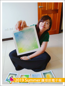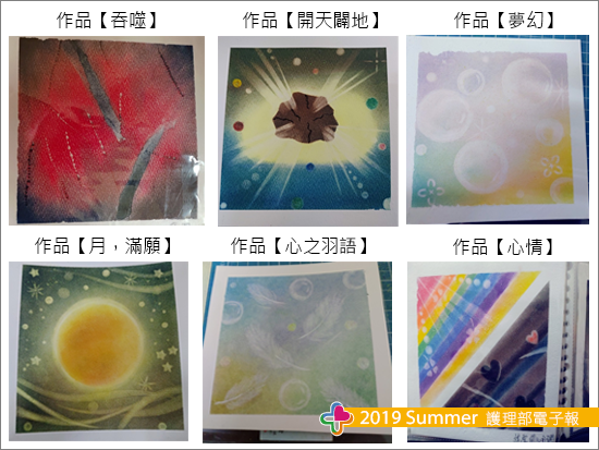 和諧粉彩首創於日本,老師講解著藝術創作理念及相關認證資訊,了解粉彩是從塊狀粉條將粉末刮下,再用手指輕沾至畫紙上塗抹,而顏色的選擇皆自由發揮,不受拘束。回想記憶所學的繪畫課,皆由畫筆、水彩筆去創作,而粉彩特別的是,不依附任何筆墨或外在線條,透過手指間的力道去創作,顏色與顏色間的縱橫交錯,毫無違和感,碰撞出的火花竟是如此美麗,讓人驚艷。在老師的教導下,第一幅畫「圓」誕生了,從上底色接續畫圓,用軟橡皮擦出光線,看到成品那瞬間,雀躍不已,天啊!真的太神奇了!指尖藝術,竟可以如此生動,由衷產生了喜悅及悸動,或許這就是創辦人的目的,讓人們的心靈都能感受到豐厚富足。