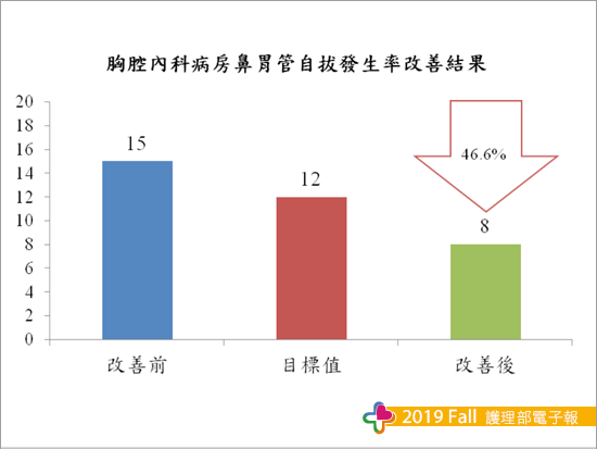 「台灣病人安全資訊網」2018年第四季通報統計,管路事件高居第三,且鼻胃管佔42.2%,其中7成為自拔(衛生福利部,2019)。對於長期照護、意識不清或混亂、吞嚥困難、易嗆食者,鼻胃管為建立營養通道的重要管路,若重覆放置產生疼痛不適及因放置錯誤導致合併症發生,不僅使病況惡化有較高的風險,且費時協助醫療團隊重置、通報捷安報、進行案例討論,造成醫療人員壓力,更增加住院天數及醫療照護成本支出。