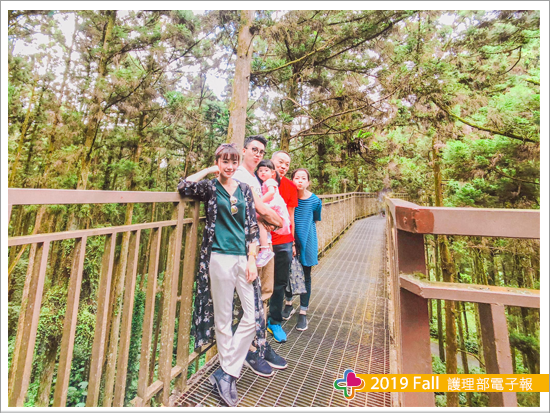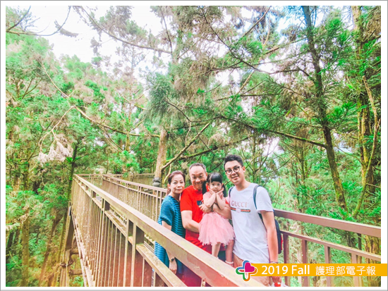 於是走了好長的一段路,我們終於來到空中走廊了,這是經由神木的林道旁一片已走過半個世紀的柳杉林,規劃建置人工林冠層生態觀察的空中走廊,全長約220公尺,最高點距地面22.6公尺,相當於7層樓高!一邊散著步,一邊大力的吸收著滿滿的芬多精,穿梭在杉林間真的很舒服呢。