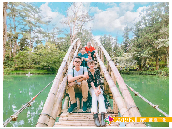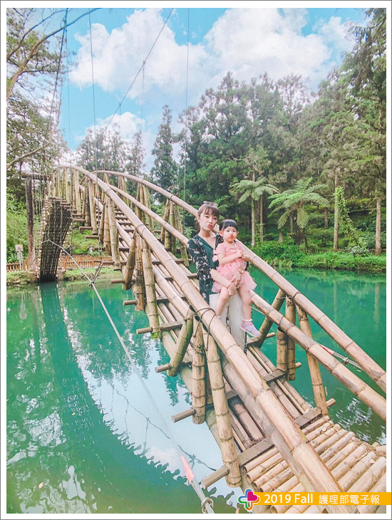 在空中步道散步完後,就又浩浩蕩蕩的步行前往大學池,大學池真的很美,有座由孟宗竹林搭建的拱橋,周圍是藍綠色的湖,整個園區還有落羽松,秋天到這裡更是另一番風景,春天到來還能看到盛開的山櫻花,一年四季景色皆為不同,景緻秀麗飄逸令人陶醉。