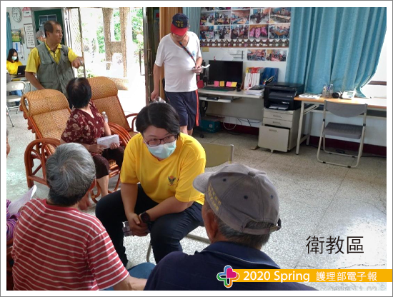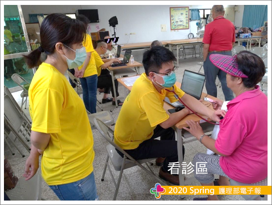 之後由領隊慧娟學姊開場介紹及說明一些巡迴流程,接下來就是大家的自我介紹時間,明明就是不熟的彼此卻擁有一種相識許久的熟識感一點也不陌生。 抵達目的地,大家團結一致的將車上醫療設備用品卸下並且整理擺位,麻雀雖小但五臟俱全(分為掛號區、看診區、領藥區、衛教區),在整理過程中,即有熱情民眾在活動中心門口等待著我們開張,印象深刻的是有位伯伯知道我們今天會來活動中心醫療服務,還把自己的胰島素帶來,就在我們量完血壓和血糖後直接上演掀肚秀注射胰島素,當然身為醫療團隊的我們也幫伯伯做一些基本糖尿病衛教加深印象;還有一位奶奶到會場就說「知道你們要來,所以我是特地來看你們有古錐好看某(台語)」,一直稱讚著我們。這次除了在活動中心做定點巡迴醫療,對於行動不方便到場者,醫療服務團隊很貼心的派出「居家訪視組」到家中訪視,一群人帶著看診用物浩浩蕩蕩如走街式到病人家中訪視。