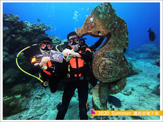 第二天早上6:20起床,準備前往「石朗浮潛區」潛水,聽著教練細心解說,背好潛水裝備,準備下水了!一開始潛下水耳朵很不舒服,要一直捏鼻子吐氣,慢慢地深潛,過程中看見清澈的海洋、珊瑚、很多魚悠游著,好快樂的感覺,教練讓我們在海底餵魚、投明信片至海底郵筒,很幸運的有發現海龜,但不幸的事我又想吐了,教練協助我吸氣→移除呼吸器咬嘴→嘔吐→呼吸,吐不出來好難受,之後上岸休息了,此時潛水裝備變得非常重,一度爬不上階梯,幸好有教練及隊友協助,這是我們第一次潛水,是很棒的經驗哦!