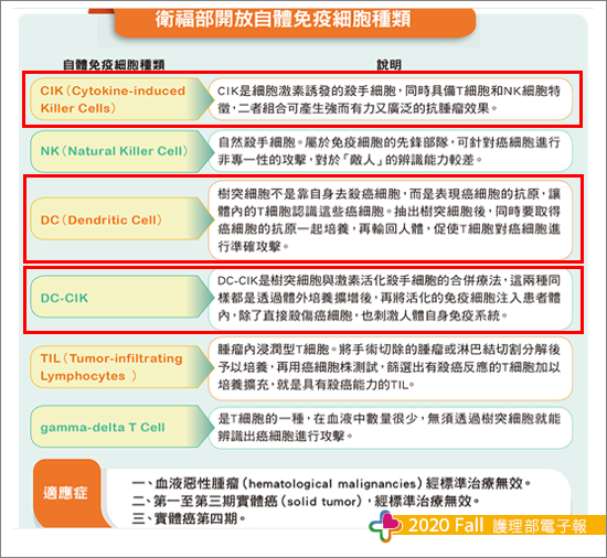 免疫細胞療法包括: LAK(lymphokine-activated killer),DC(dendritic cell),CIK(cytokine-induced killer cell),DCCIK,CAR-T(chimeric antigen receptor T-cell), TCR-T(T cell receptor chimeric T-cell),NK(nature killer),CAR-NK,腫瘤浸潤性淋巴細胞(tumor infiltrating cells, TIL)等。 以下針對本院目前推行之樹突細胞治療進行介紹。