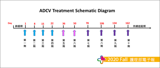 4.治療給藥期:ADCV01療程共10劑採皮下注射,前4劑於每週進行一次,共4次;接續的2劑則每雙週進行一次,共2次;最後4劑,則為每四週進行一次,施打當天生技公司解凍後送到醫院,48小時內由醫師注射於雙側腋下皮下淋巴結區域。注射前後照護重點包含:(1)每次注射前,醫師會評估病人身體狀況(評估內容包括:生命徵象、理學檢查、實驗室檢驗結果、病患有無不良反應出現等),再決定是否適合注射自體樹突細胞疫苗、(2)每次疫苗注射結束,病人需留院密集觀察至少2個小時,第一個小時需每15分鐘測量病人生命徵象、全身有無皮膚癢疹(過敏反應症狀)、注射部位有無紅腫熱痛情形;第二個小時需每30分鐘測量生命徵象,經兩小時觀察後,確認病人無不良反應後再讓病人返家、(3)自疫苗注射後第二天起,每日電話訪查病人有無發燒、倦怠、皮膚癢疹及注射部位紅腫熱痛情形連續三天並留有紀錄,如有不適則安排病人回診治療