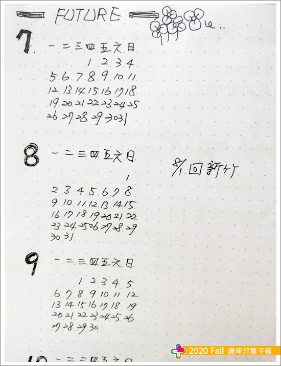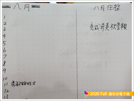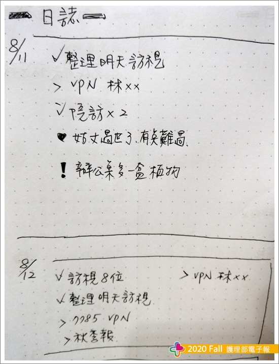 求學階段總是最後一秒踏進學校,報告也總是要火燒屁股才開始寫,時間控管大概是我腦中遺失的一塊拼圖,每年總喜愛到書局購買精美的記事本,卻總是寫了兩頁就維持空白。直到職涯規劃走進社區,轉調至居家護理,才發現每位學姊都有一本屬於個案管理的筆記本,自然的我也從交班的學姊手中,獲得一本個案管理傳家寶之類的筆記本,傳承到寫了一半的筆記本,才發現居家事情真是又多又雜,要排車、排醫生、排開藥時間、備物時間,還要算錢、注意個案什麼身分別?車資多少啊?...等等之類的,才發現在居家工作,若沒有一本筆記本真的是會死人...,但是光有筆記本無法將我頭腦中打結的思緒整理好,於是我開始尋找克服的辦法,一直到我發現子彈筆記(Bullet Journal),才真正讓我踏上正軌,所以我想為大家介紹這本(Ryder,2018/2018),希望能讓大家了解。