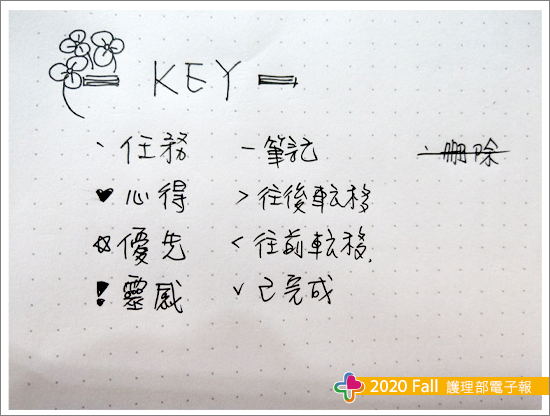 Bullet Journal基本上包含:(1).索引/標註主題內容之頁碼:先空白4頁再依筆記內容,回頭來書寫索引,更有系統的查找筆記內容位置;(2).未來誌/用來記錄非當月的任務:利用跨頁分六格,年誌的意思;(3).月誌/當月時間與任務安排:左半日曆頁,右半任務頁,這部分請務必精簡,詳細的內容留在月計劃與日計劃中;(4).日誌/每日想法記錄:要領是描述每項任務與事件皆應該簡短、明確,例如「記得聯絡XX個案訪視時間,並討論抽血單使用時機」,就可以縮短為「XX:訪視時間、抽血單」;(5).快速記錄/運用符號與記號記錄想法、劃分成註記、事件與任務等不同類別;(6).群組/子彈筆記的模組化,可以用來整合相關內容,你也可以建立任何想記錄的群組:例如旅行、準備考試,讀書清單...;(7).轉移/檢視子彈筆記的內容,若今天的任務未完成,需前後移動,則需要反思挪動的事件是否真的需要完成,或是自己的排序不清,經檢視確認不重要則要淘汰,避免堆累太多不需要完成的任務。