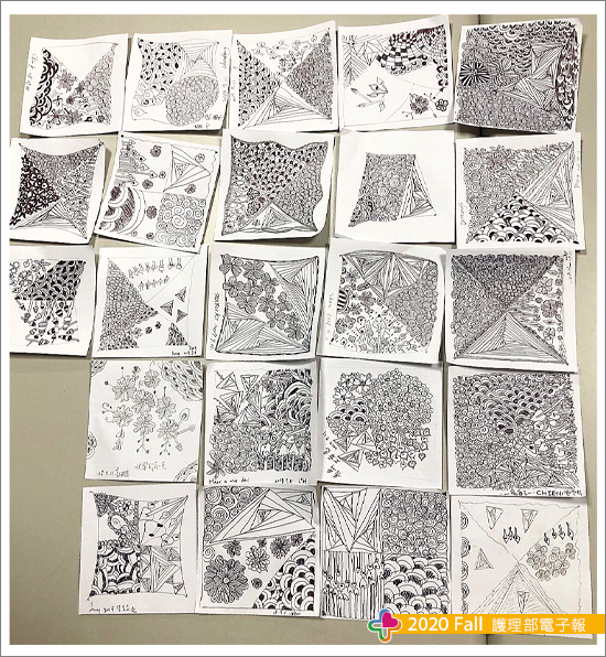很榮幸在大台南護理師護士公會柳營區長邀請下參與講座,當中學員除了本院的護理人員外,則是柳營區域的診所、護理之家或其他醫療院所的護理人員,過去曾經跟護理前輩討論關於護理人員特質,有共同想法是:護理人員因工作屬性緣故是最不容易靜下來的一群人。在上課開場跟參與的同仁講解纏繞心法,不需要有繪畫天份,只要具備握筆能力皆可以完成一幅畫作,畫的過程預期中的希望用尺將線畫直,或是線條畫完不滿意橡皮擦來去好幾回,請大家收起橡皮擦與尺,纏繞過程沒有是非錯,沒有美醜,完全是在那當下與自己對話過程,在事先錄製的繪圖影片撥放,讓大家體驗纏繞過程的靜心,穿插講解晢理,在空靈的音樂下,每個學員完成了自己的一幅畫作, 這堂課是靜心的開端,未來在生活的持續練習才是纏繞本身的精神,你準備好了嗎?只要備有鉛筆、黑筆及紙磚就可以開始纏繞…
