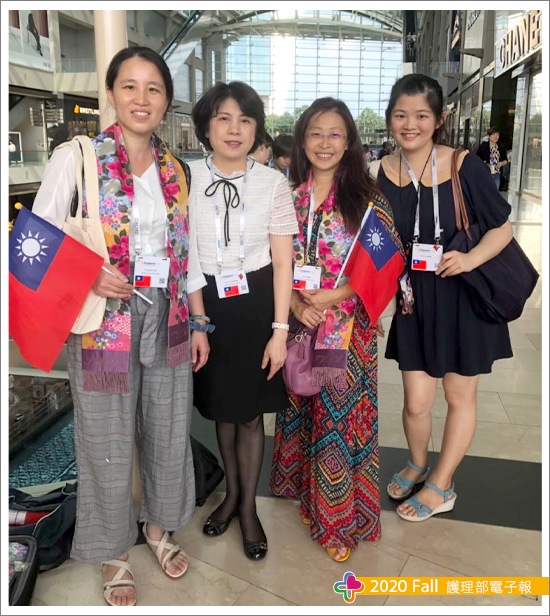 2019年6月27日在研討會開幕晚會前,學會人員緊急通知無法帶國旗入場,在學會協助下我們在名牌上別上徽章與戴上圍巾進場,此次ICN大會有144國參與,超過5000位護理師共襄盛舉,各國代表上台時各國護理師在台下吶喊自己的國家,在台灣護理學會代表進場時,我們手搖學會發給的圍巾,吶喊著「Taiwan、Taiwan、Taiwan」,連後方的 Slovenija的護理師也幫著我們一起吶喊著,第一次發現國家的重要、國家認同的重要,在當下心情非常地激動,看到學會的大老們、永康院區的江副部長在此次大會上的努力與付出,讓我深深感動,雖然自己是那微小的一員,卻能當下站那為台灣發聲吶喊。