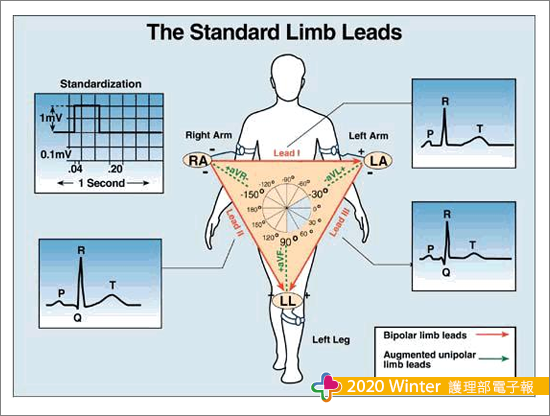 心電圖上十二導程的定義,包含六個縱切面及六個橫切面,縱切面分為三個標準之導程及三大增大導程,橫切面則為胸前導程 (陳,2017)。標準導程:肢導極定義的量測位置,如圖一(ECG Learning Center, 2020)