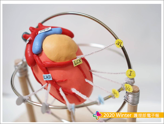 心臟為三度空間的器官,故以三度空間邏輯概念理解電氣活動傳導;運用製作3D心臟模型對應心電圖十二導程的電活動,以生理解剖的理解方式,在腦海中浮現3D心臟影像與導程的分布圖,執行初步判讀急性心肌缺血或損傷的位置,因此經上述胸導程與肢導程兩者結合,建構冠狀動脈直接對應的導程,進而反應在十二導程心電圖,以3D心臟模型三條冠狀動脈及心肌壁對應心電圖十二導程的電氣活動,圖三採用色彩概念導入標示,將十二導程及冠狀動脈用顏色執行相對應歸納,以輕鬆利用圖像記憶法記憶。