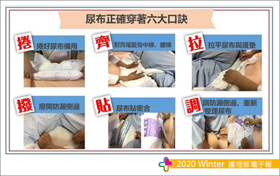 護理團隊依據日本指導講師授課內容及標竿學習,發展紙尿布正確穿著的六字口訣:「捲、齊、拉、撥、貼、調」,以利護理同仁與照護者學習(圖五)