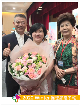 怡珍護理長在典禮前分享:父親在台南偏鄉開藥房,母親是小兒科護理人員,家中小孩從父母親身上學到待人的善解與付出,因此與姐姐二人都踏上護理之路;從護理學校畢業後,進入幸福醫院奇美醫院,踏入職場的第一個單位是急診,置身緊急醫療及急重症照護的第一線9年,歷經多次台灣重大災害與疫情,也在時任護理長的蕭素秋督導鼓勵下推廣急救觀念於社區;轉任外科病房擔任護理長期間看見口腔癌手術後病人的口腔照護需求,在陳筱蓉女士,長榮大學許雅娟主任帶領下深入探討口腔癌術後照護,將臨床經驗與學術結合建置『口腔癌術後口腔照護』及『吞嚥進食安全訓練』標準,改善口腔異味及吞嚥恢復時間,並發展『口腔癌術後病人口腔狀態評估表』,提供護理師客觀性評估和護理措施的依據,成果除了在四個學術研討會進行發表之外,也在三個專業期刊刊登;從2014年迄今擔任骨科病房護理長期間,看見骨科手術病人活動困難與限制問題,致力導入實證知識,建置骨科病人照護標準,同時透過郭嘉琪高階護理師及柯雅婷督導的輔導,落實實證知識轉譯於臨床,成效良好,且獲得「4th、6 th台灣實證護理學會」銅獎與金獎、「2017、2019年醫策會」實證醫學類臨床運用組知識轉譯組佳作與銀獎,並與葉玲復健護理師共同研發復健創意輔具『彈性懸吊帶』及『可拆式滾動按摩裝置』,降低病人復健疼痛,增加日常活動功能,另外也跟骨科團隊共同製作醫病共享決策輔助工具,擬定符合病人期望之醫療決策。在忙碌的臨床工作之外也將經驗傳承,兼任學校護理教育,協助培育護理學子,休假時間有機會也參與推廣口腔衛生教育及參與社區服務。