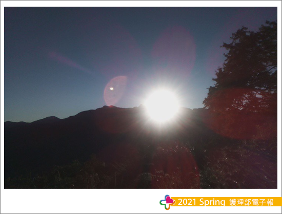 第二日的重頭戲~日出!觀看日出我選擇早起搭乘五點半的小火車,但碰巧遇到祝山車站整修中,故此次小火車停在前一站「高岳」,抵達後開始尋找觀日位置並等待,在等待的過程中寒風不斷吹拂,約六點四十五分左右,出現了一道曙光,那感覺彷彿重獲新生,一切是這麼的美好,寒風中的等待是值得的!看完日出後,我們搭乘遊園車、小火車前往沼平線、神木線,觀看許多美景,造訪了三代木、木蘭園、巨木棧道及台灣最高小學-香林國小。