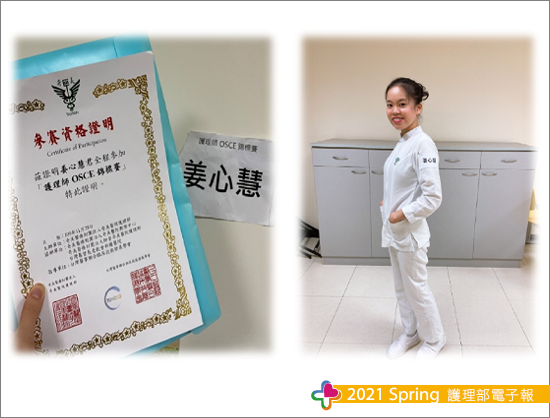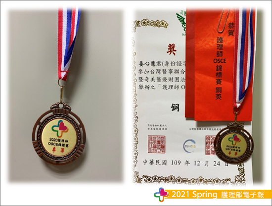 完賽後,放下心中巨石,那天上小夜班,在治療途中,阿長呼喚著我,給我看手機一張OSCE競賽的得獎名單,一開始我還從優選中找尋我的名字,最後發現是「銅獎」!天啊!真的難掩內心的興奮與喜悅,嘴角不禁上揚了起來,若不是在病人面前,我應該想要跳躍地大叫吧!除了銅獎帶給我的實質回饋,最大的收穫莫過於戰勝自己內心的畏懼,沒被當初的挫折給囚禁、框架住,我很感謝參賽過程的二位阿長,對我的鼓舞、增進我的信心,讓我突破心魔,更明白沒去挑戰,就別輕易說不行;也謝謝為我加油、祝賀的家人、朋友、單位同仁。最後更謝謝自己的勇敢,讓自己在一生一次的兩年期護理師訓練過程增添一筆色彩。
