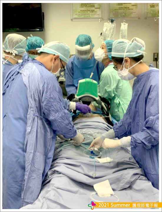 故事開始於105年6月某一個病人瘋狂湧入的小夜日常,救護台通報一名溺水中年女性,到院前已無生命跡象,急診團隊接獲訊息後繃緊神經準備就緒等待病人到來,很快的,門外傳來救護車以時速200公里速度抵達急診門口,在急診團隊接手後開始了積極的搶救行動,護理師觸摸著似有若無的頸動脈,醫師看著超音波探頭下要跳不跳的心臟,此時突然傳來斬釘截鐵的聲音「我們來啟動PCPS!」,隨即,小小的急救區裡湧入多位醫護人員各就各位,護理師準備PCPS機器的Priming、醫師埋頭置放PCPS管路,在大家同心協力下成就了第一例的ECPR,俗話說「第一次ㄟ挫、第二次ㄟ驚、第三次尬你拼」(台語),秉持著「尬你拼(台語)」的急診魂精神,急診團隊慢慢累積了一次、二次、三次的實戰經驗,截至目前已經完成55例的ECPR。