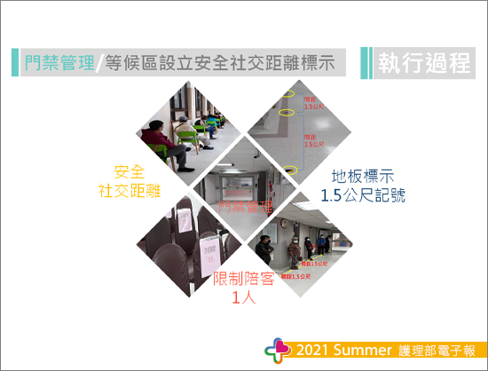 為避免群聚感染,杜絕透析室交叉感染的可能性,第一步即進行門禁管理,禁止非當班透析相關病人及家屬進入透析單位,減少病人相互接觸頻率;候診區地上標示社交距離1.5公尺記號,增設透析防疫宣傳海報,讓病人更加了解且遵守防疫政策。
