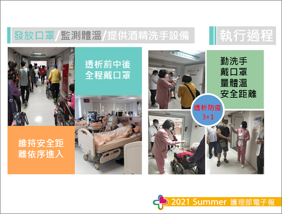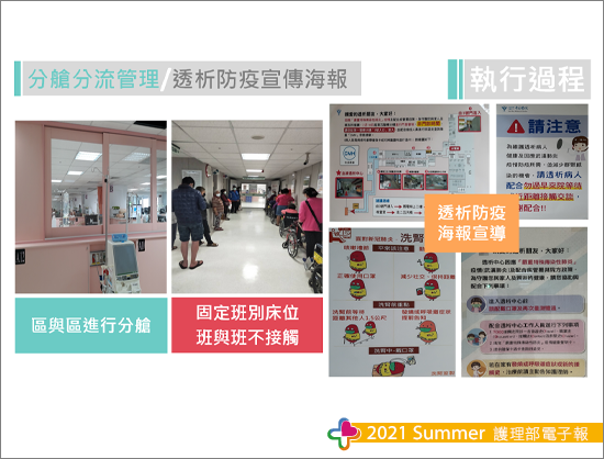 加強透析環境及設備消毒,每日均以0.05%漂白水進行擦拭,針對高接觸性之透析病床,每次透析治療後均以75%酒精擦拭。針對透析病人及家屬進行體溫測量、提供充足洗手設備,TOCC調查及健康聲明資訊收集亦是重點之ㄧ。因應分艙分流管理概念,透析病人一律固定班別及床位,於各區加裝分區隔板以杜絕空氣中飛沫傳播機會。