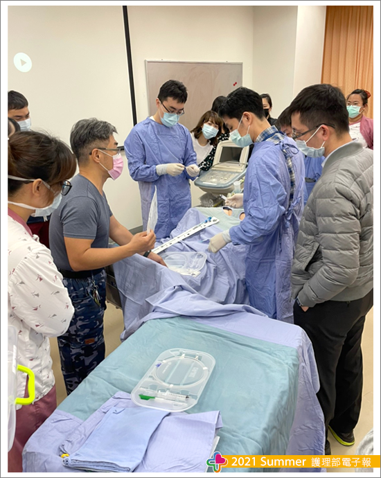 再來模組的實際操作,重點在於醫生放置管路,讓護理師也學習在超音波的輔助下如何放置管路,一手拿超音波一手要拿管路,平常看醫生放置的過程還蠻輕鬆的,自己嘗試操作,才知道不容易。課程結束後,我想,當我們接收啟動體外循環系統的指令,大家腦中皆會浮現一連串的標準作業、流程,將病人及儀器各就各位,大夥們應該不再手忙腳亂,或有很多人搶一個工作的窘境,如成組CPCR般的訓練過程,讓整個PCPS會更順暢。