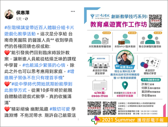 現在的教學要如何突破,負責教育訓練委員會師資培育課程規劃,思考如何讓老師教學有熱忱,且學員學習要有成就,在江惠英副部長及柯雅婷督導協助下,有機會與聯合訓練醫院媒合,與侯惠澤教授的子弟兵聯繫上才成就此場課程。沒想到一開放以「秒殺」速度報名截止,可見大家對於教學有所期待及改變。從一開始的規劃與侯老師溝通多次帶領方式及子弟兵用心調整,因本院為階梯講堂,又遇到疫情,其研習會人數不能過多考驗,侯老師事先知悉其環境限制,老師能隨時調整,也獲得老師的肯定(附圖摘自侯惠澤老師臉書)。