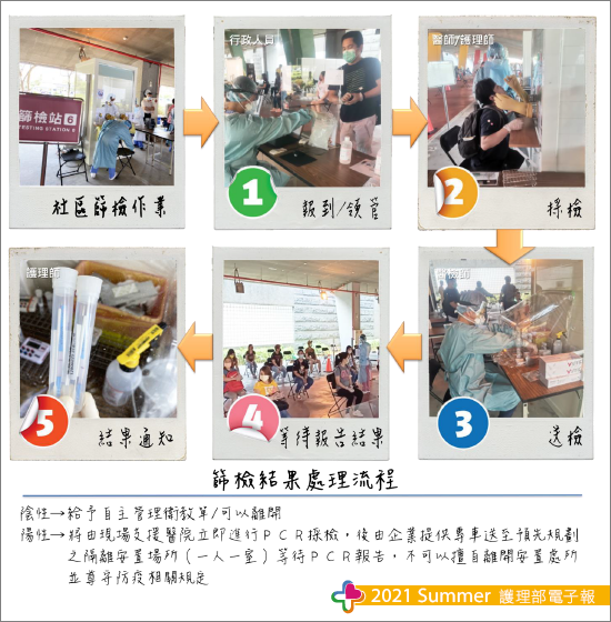 篩檢站採分時段、分流的方式進行,移工在指引下進入各個篩檢站執行快篩,若為陽性,立即再進行PCR採檢,並由企業提供專車將被採檢者送至預先規劃的隔離安置場所(一人一室)等待PCR報告,期間不可擅自離開,並嚴格遵守防疫相關規定,以杜絕感染進入社區。